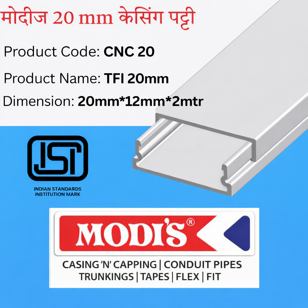 Modi’s Casing Caping 20mm is crafted from high-grade, lead-free PVC that offers durability, fire resistance, and a neat aesthetic finish. Whether you’re wiring a new home, an office, or a large factory, this cable ducting solution ensures your electrical setup remains organized and protected.